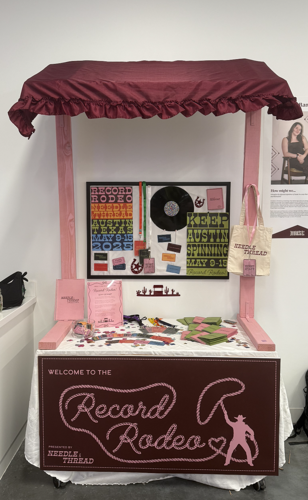 Needle & Thread: Record Rodeo is a traveling vinyl trading pop-up that reimagines the physical experience of music in a digital age. Rooted in community, storytelling, and tactile design, the event encourages participants to swap records, share memories, and reconnect through analog experiences. Each pop-up features a unique visual identity inspired by its host city, starting with Austin, Texas, which blends nostalgic vinyl culture with contemporary design. Through branding, physical artifacts like a “Record Passport,” and immersive event materials, this project explores how design can build connection and revive the communal spirit of music collecting. My final deliverable was a welcome booth for my imagined event, which I fully designed and built.